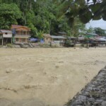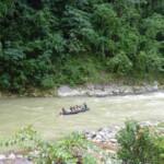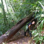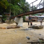 Dann ging es zum desinfizieren erst einmal zum Guesthouse zurück. Am Abend bekamen wir ein anderes Spektakel zu sehen und zu hören. Wir saßen gerade beim Abendessen als wir ein lautes grollen bemerkten. Es waren die Steine im Fluss die durch das Wasser in Bewegung kamen. Der Fluss Bohorok stieg stark an und die Einheimischen standen ein wenig unruhig am Flussrand. Es muss Flussaufwärts einen Erdrutsch in Kombination mit starkem Regen gegeben haben. Die Wassermassen transportierten riesige Baumstämme wie Zahnstocher flussabwärts und wir mussten an die Flutkatastrophe in Bukit Lawang aus dem Jahr 2003 denken. Hier verloren 300 Menschen ihr Leben und das komplette Dorf war zerstört. In unserem Guesthouse sagte man uns, dass es seit einem halben Jahr keinen so großen Anstieg des Flusspegels mehr gab. Die Situation beruhigte sich aber glücklicherweise. Der Pegel stieg nach ca. 1,5 Stunden nicht weiter an. Am nächsten morgen sahen wir welche ungemeine Kraft die Natur hat. Eine Brücke war leicht zerstört und die großen Baumstämme, die im Wasser lagen mussten alle zersägt und rausgefischt werden damit diese keine weiteren Schäden anrichten können.