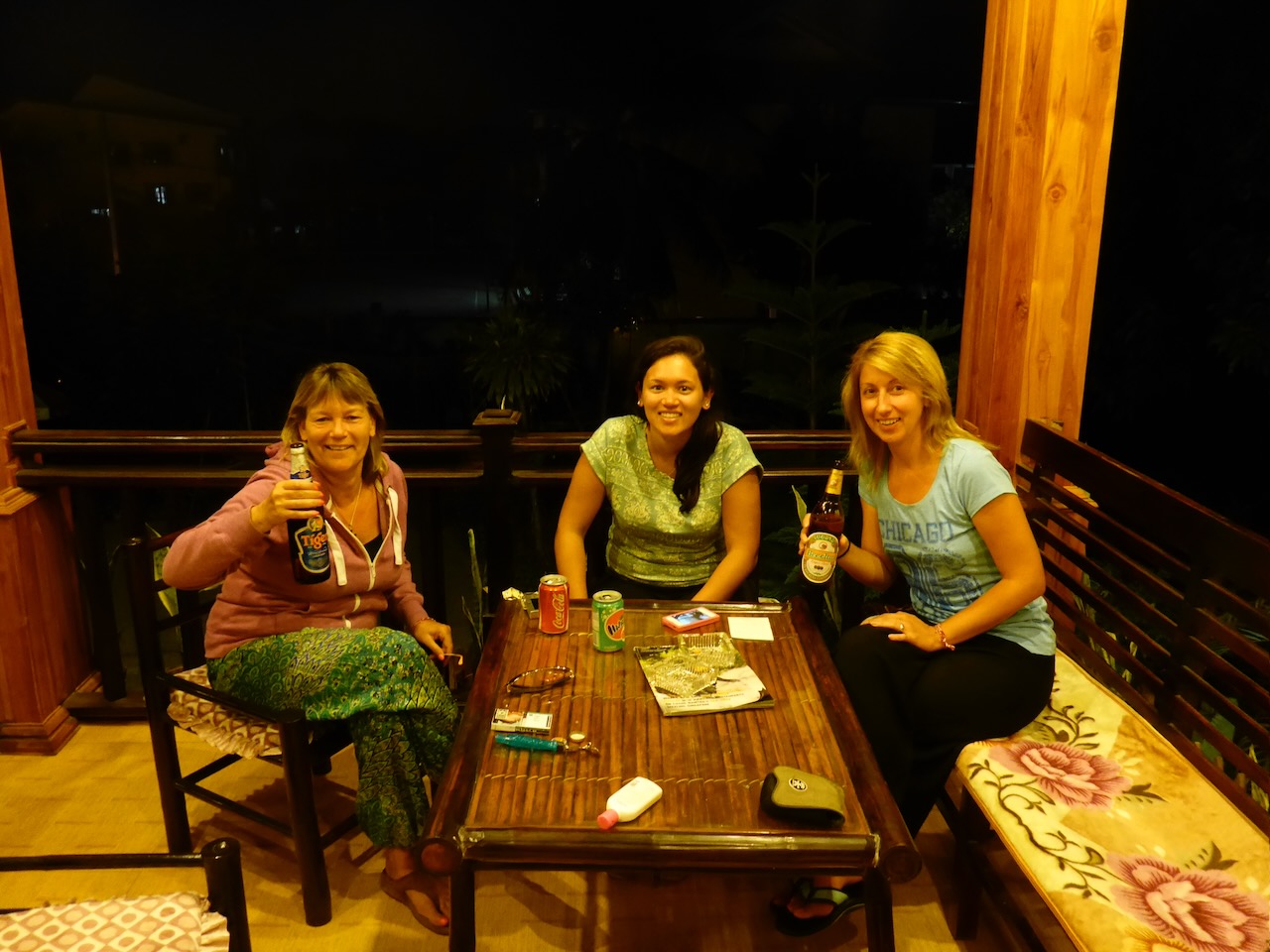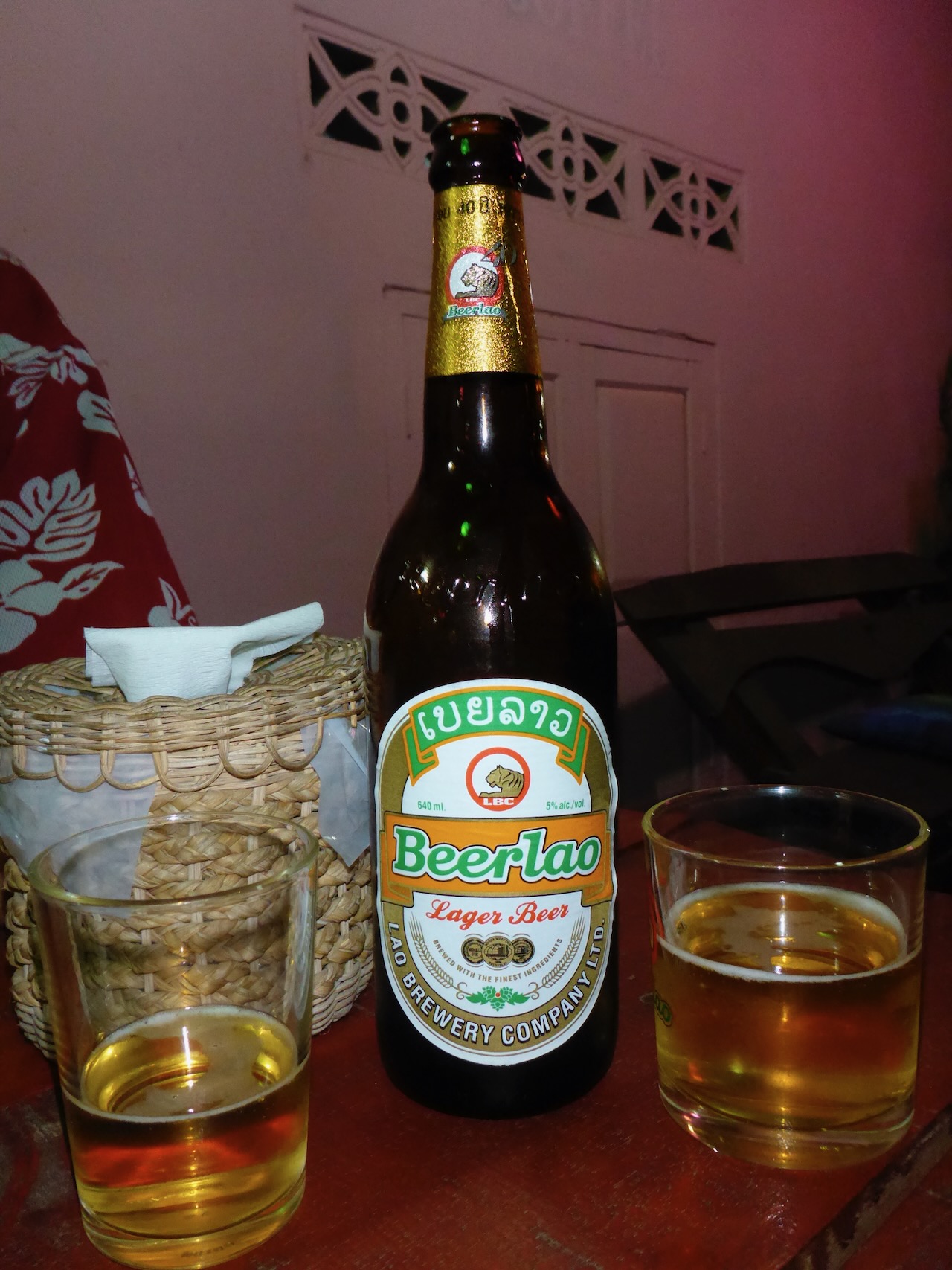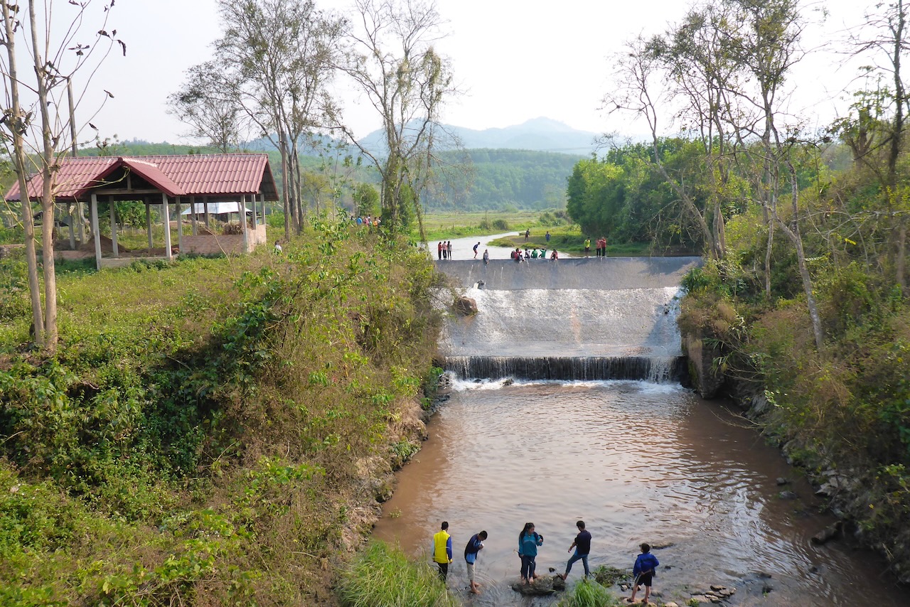 Am nächsten morgen gingen Nicky und Frau Rutzel erneut auf die Suche und kurz danach sind wir in das Thoulasith Guesthouse eingezogen- ein zweistöckiges Haus mit sehr sauberen Zimmern, netten Balkon und sehr freundlichem Personal. Danach stand die erste Stadterkundung an. Wir stellten schnell fest, dass die Stadt an sich nicht so viel zu bieten hat, aber schliesslich sind wir wegen der Natur hierher gekommen. Wir mieteten uns am Weltfrauentag, für alle die es nicht wissen, es ist der 8. März eines jeden Jahres!, ein Fahrrad und erkundeten die Gegend. Überall wurde kräftig, mit lauter Musik und Lao Bier gefeiert, vor allem in den kleinen Dorfgemeinden. Die jüngere Generation zog sich hierfür zum Wasserfall, den wir über die Schotterpiste ansteuerten, zurück. Das Fahrrad geparkt, den kleinen Eintritt bezahlt und nach wenigen Metern erreichten wir den „Wasserfall“ ;-). Es gab kaum Wasser, aber dafür bekamen wir von den Jugendlichen Bier angeboten. Nach dieser kurzen Bierstärkung ging es weiter auf einem steilen, schmalen Pfad oberhalb des Wasserlaufs entlang. Wir kamen immer höher und zwischendurch wussten wir nicht, ob wir den ganzen Weg wieder zurück müssen oder wir einen Rundweg in Angriff genommen haben. Nach 45 Minuten bekamen wir ein kleines Dorf zu sehen, welches sich an der Straße befand, wo auch unsere Fahrräder standen. Wir hatten alles richtig gemacht. Wir sahen im Anschluss noch einige schöne Reisfelder und der erste kleine Ausflug hatte uns Lust auf mehr gemacht.