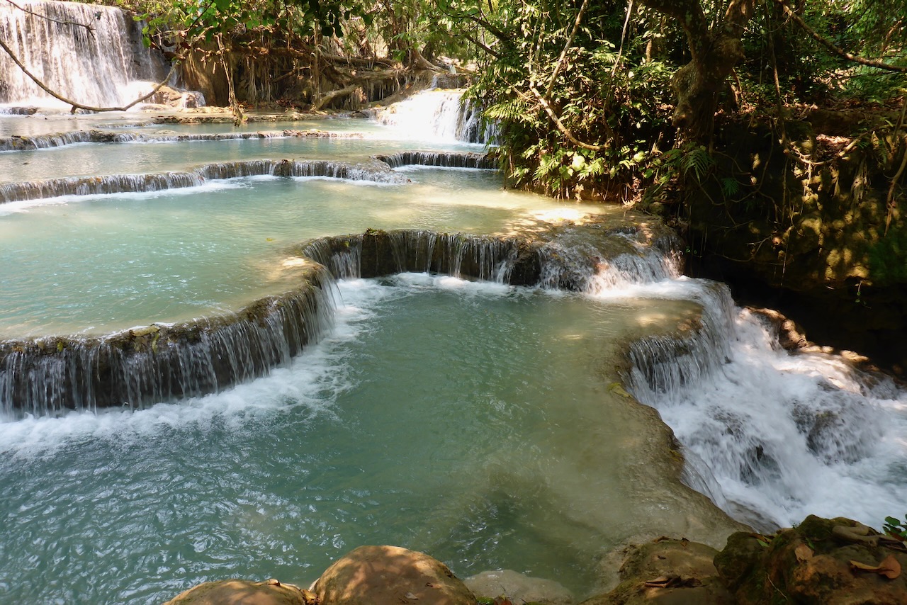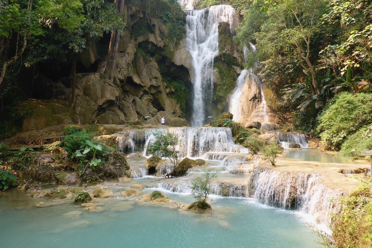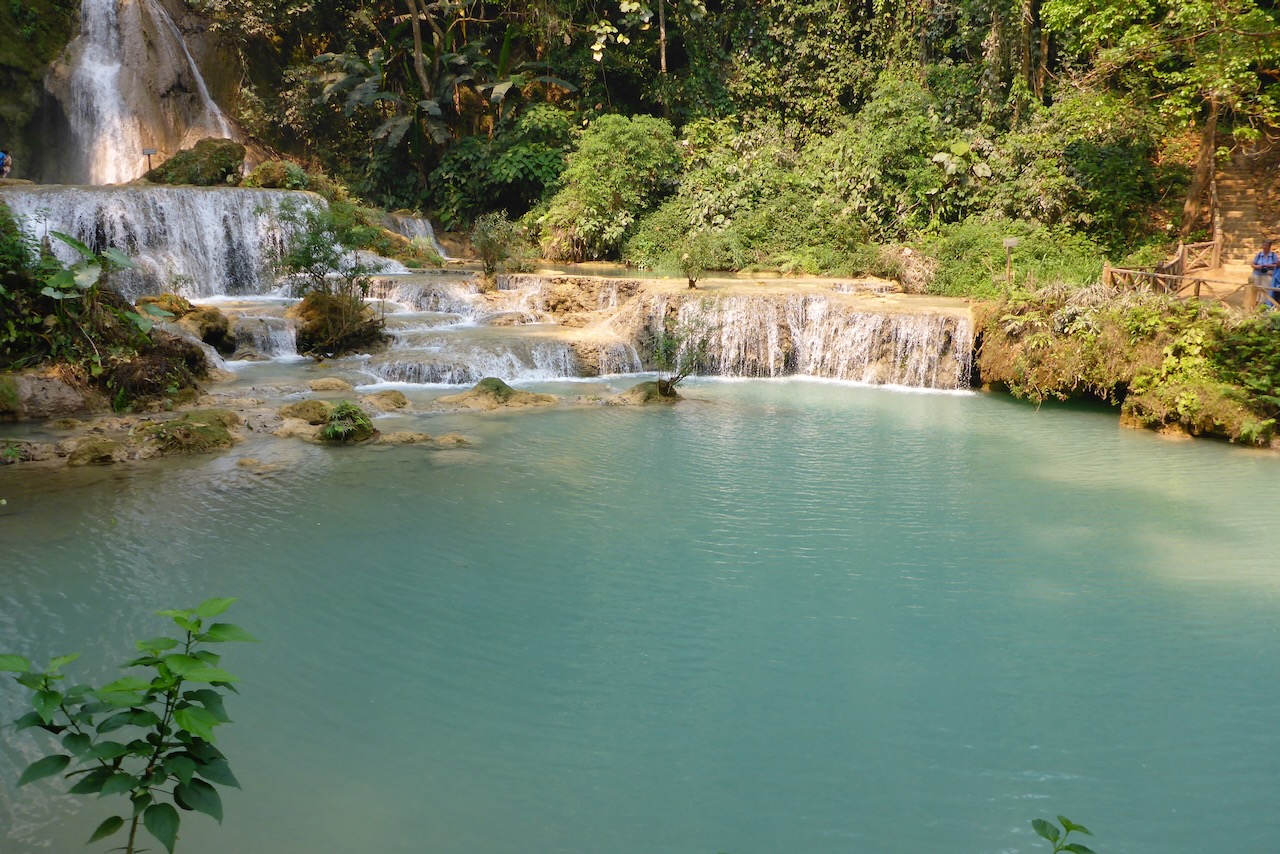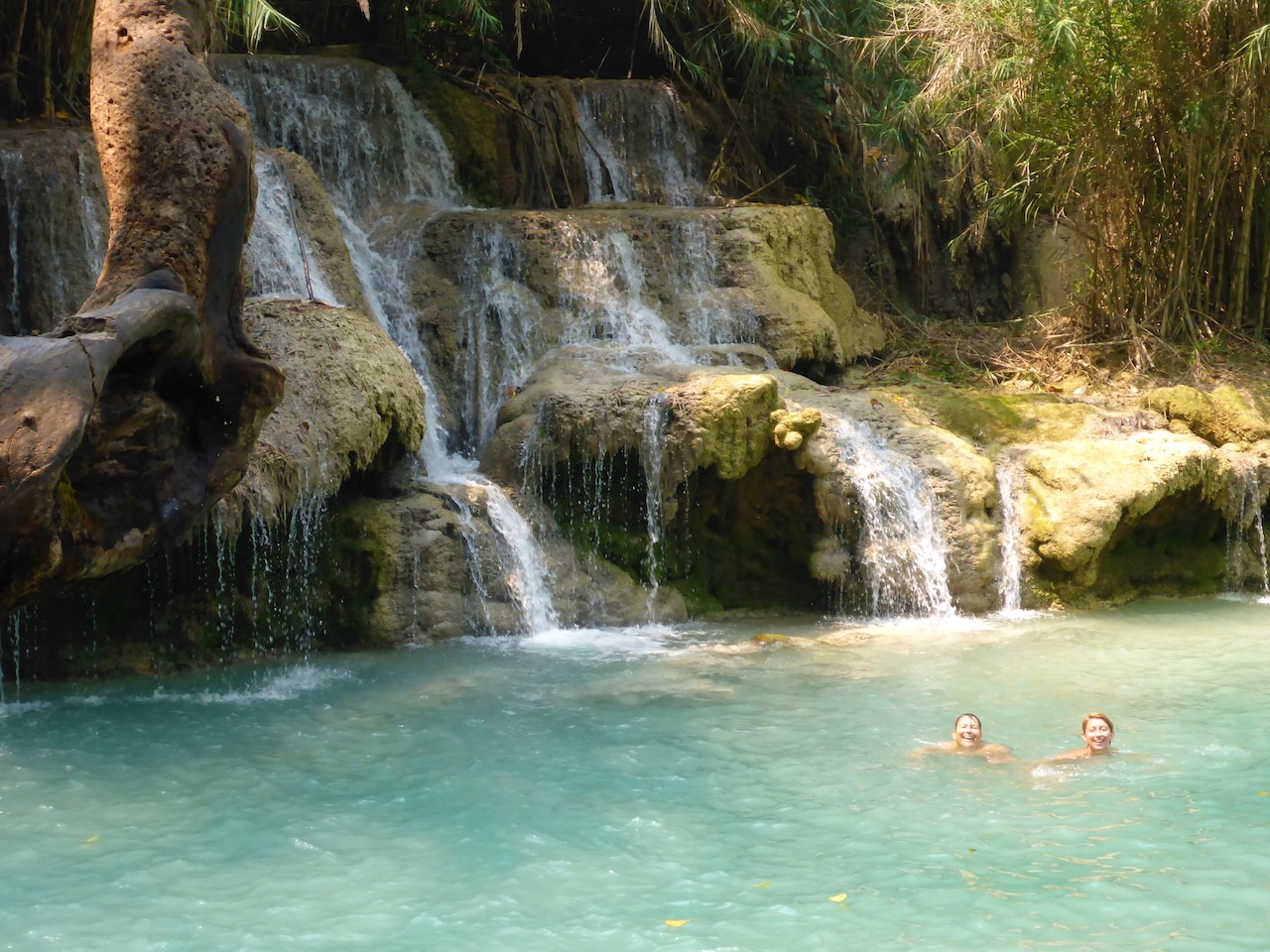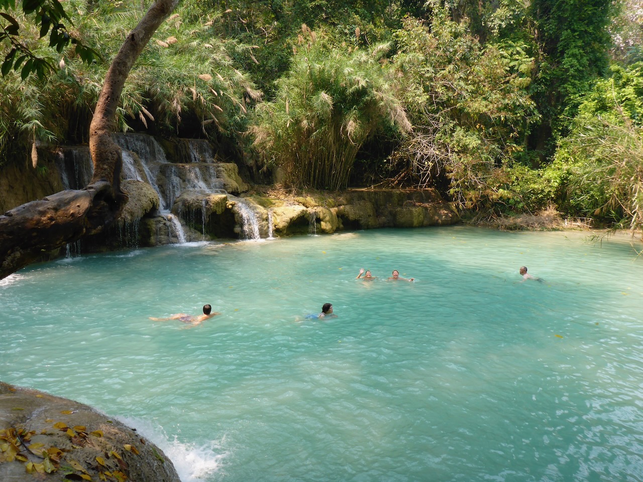 Die Uhr zeigte uns 19:30 Uhr an, als wir den Busbahnhof in Luang Prabang erreichten. Mit dem sorngtaaou (Lieferwagen oder Pick-ups mit Bänken auf beiden Seiten) liessen wir uns in die Stadt fahren, wo wir nach kurzer Zeit das familiengeführte Thephavong Guesthouse als Unterkunft wählten, in der die liebenswerte Vermieterin “das Herzstück” war. Im Anschluss hatten wir die Qual der Wahl zwischen den vielen Baguettes-Ständen, die am Nachtmarkt ansässig waren. Warum gibt es in ganz Laos und insbesondere hier eigentlich so viele Baguettes und Croissants? Laos war von 1893 bis 1953 eine französische Kolonie und das beweisen nicht nur die Gerichte, sondern auch die alten Kolonialvillen, die meisten heutzutage in Boutique-Hotels verwandelt. Luang Prabang besitzt eine besondere Mischung aus altem Charme und buddhistischen Tempeln, hat tolle Cafés und einen entspannten Nachmarkt, was insbesondere an der ruhigen und relaxten Art der Laoten liegt. Die Stadt, die man am besten vom Hügel Pousi überschauen kann, lädt zum faulenzen ein, aber auch die Umgebung hat einiges zu bieten. Der Kuang Si Wasserfall ist hier in aller Munde und so lachten wir 4 uns doch tatsächlich einen netten Tuk-Tuk Fahrer an, damit er uns zu dem 40km entfernten Ort bringt. Um dem Touristentrubel zu entgehen, reisten wir schon um 9 Uhr morgens an und es hatte sich wahrhaftig gelohnt. Die Farben des Wassers sind einfach „wow“. Nachdem wir die ersten Fotos geschossen haben, wollten wir natürlich auch den steil anfallenden Weg zu der oberen Ebene des Wasserfalls wandern. Völlig verschwitzt konnten wir den schönen Blick aus der obersten Etage geniessen und im Anschluss wartete das grüne Wasser auf unsere Überhitzten und etwas muffligen Körper. Während der Rutzel ein Paar “Wasserbomben“ machte, hat sich Frau Rutzel von dem natürlichen „Fisch-Spa“ behandeln lassen- herrlich :-). Es gibt hier auch eine Auffangstation für Malaienbären. Diese wurden aus der Käfighaltung von Privatpersonen gerettet und dürfen nun in einer größeren Anlage zumindest ein etwas besseres Leben führen. Der Rutzel durfte beim betrachten der Tiere den folgenden Satz einer deutschen Touristin belauschen: “Och, die Tiere haben hier so ein schönes Leben…”? Teilen konnte er ihre Meinung nicht, aber wenn man sich unseren Umgang mit der Mutter Natur betrachtet, dann konnte er ihr auch nicht widersprechen.