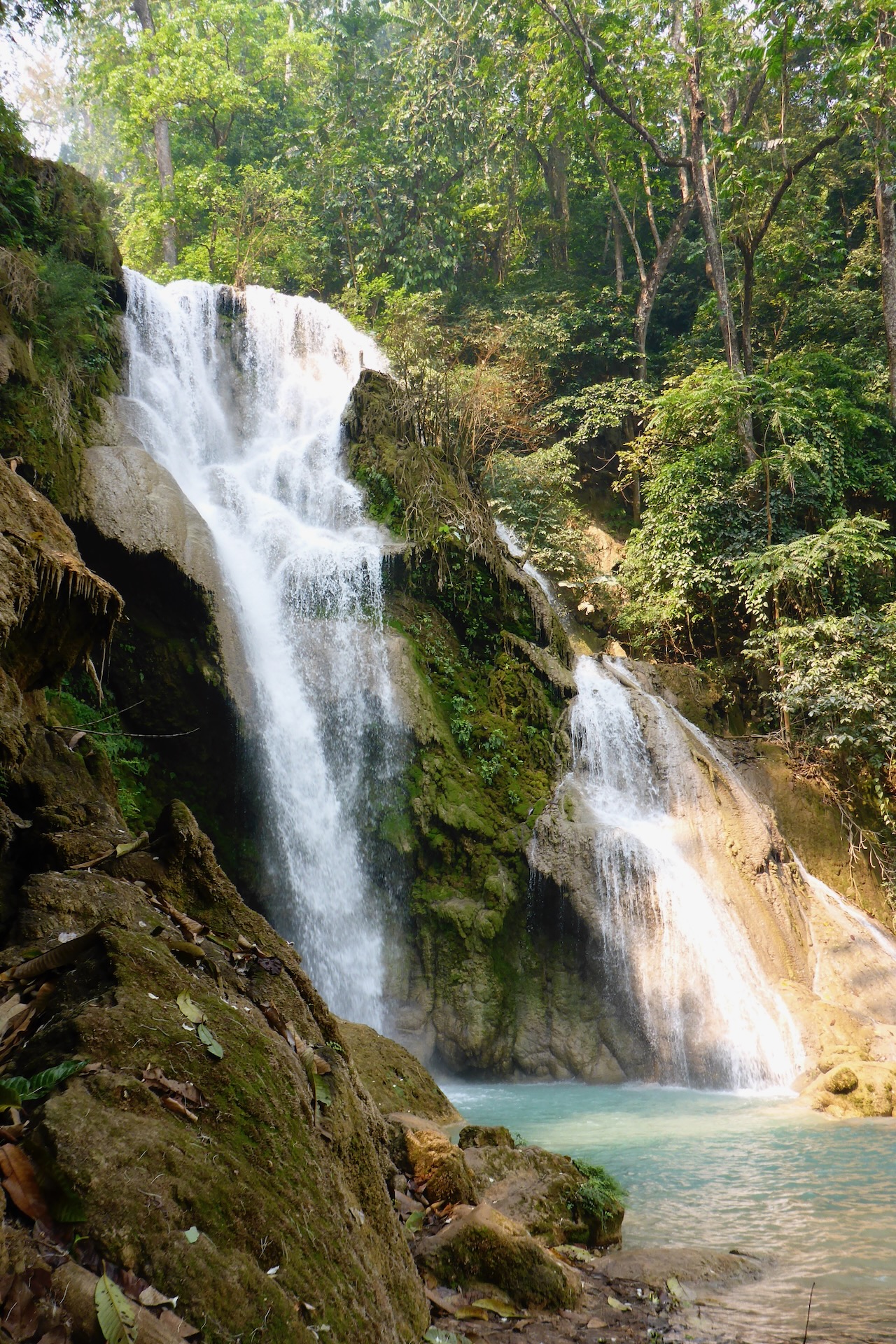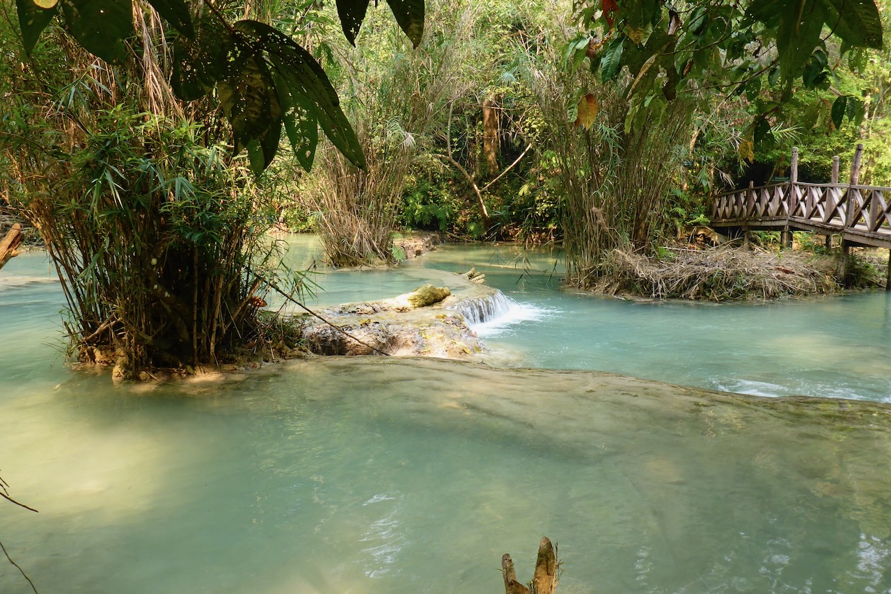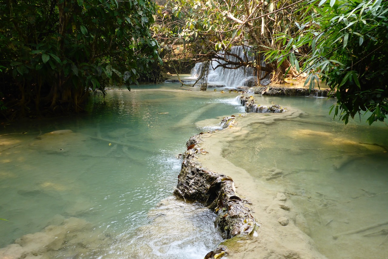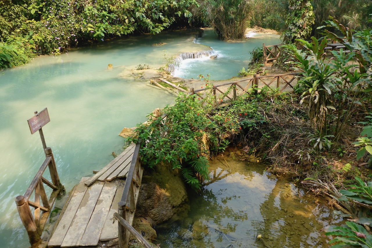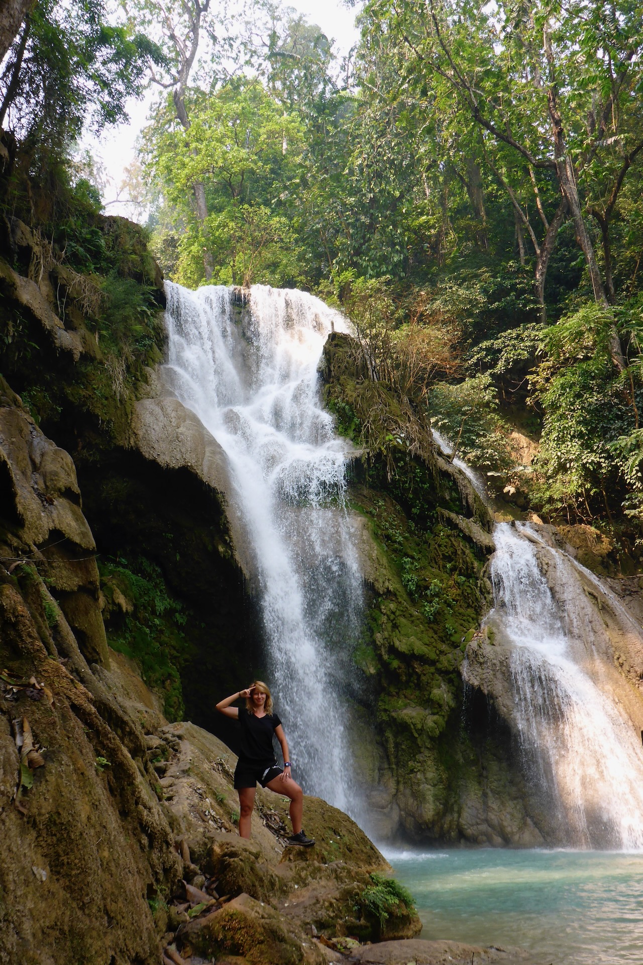 Die Uhr zeigte uns 19:30 Uhr an, als wir den Busbahnhof in Luang Prabang erreichten. Mit dem sorngtaaou (Lieferwagen oder Pick-ups mit Bänken auf beiden Seiten) liessen wir uns in die Stadt fahren, wo wir nach kurzer Zeit das familiengeführte Thephavong Guesthouse als Unterkunft wählten, in der die liebenswerte Vermieterin “das Herzstück” war. Im Anschluss hatten wir die Qual der Wahl zwischen den vielen Baguettes-Ständen, die am Nachtmarkt ansässig waren. Warum gibt es in ganz Laos und insbesondere hier eigentlich so viele Baguettes und Croissants? Laos war von 1893 bis 1953 eine französische Kolonie und das beweisen nicht nur die Gerichte, sondern auch die alten Kolonialvillen, die meisten heutzutage in Boutique-Hotels verwandelt. Luang Prabang besitzt eine besondere Mischung aus altem Charme und buddhistischen Tempeln, hat tolle Cafés und einen entspannten Nachmarkt, was insbesondere an der ruhigen und relaxten Art der Laoten liegt. Die Stadt, die man am besten vom Hügel Pousi überschauen kann, lädt zum faulenzen ein, aber auch die Umgebung hat einiges zu bieten. Der Kuang Si Wasserfall ist hier in aller Munde und so lachten wir 4 uns doch tatsächlich einen netten Tuk-Tuk Fahrer an, damit er uns zu dem 40km entfernten Ort bringt. Um dem Touristentrubel zu entgehen, reisten wir schon um 9 Uhr morgens an und es hatte sich wahrhaftig gelohnt. Die Farben des Wassers sind einfach „wow“. Nachdem wir die ersten Fotos geschossen haben, wollten wir natürlich auch den steil anfallenden Weg zu der oberen Ebene des Wasserfalls wandern. Völlig verschwitzt konnten wir den schönen Blick aus der obersten Etage geniessen und im Anschluss wartete das grüne Wasser auf unsere Überhitzten und etwas muffligen Körper. Während der Rutzel ein Paar “Wasserbomben“ machte, hat sich Frau Rutzel von dem natürlichen „Fisch-Spa“ behandeln lassen- herrlich :-). Es gibt hier auch eine Auffangstation für Malaienbären. Diese wurden aus der Käfighaltung von Privatpersonen gerettet und dürfen nun in einer größeren Anlage zumindest ein etwas besseres Leben führen. Der Rutzel durfte beim betrachten der Tiere den folgenden Satz einer deutschen Touristin belauschen: “Och, die Tiere haben hier so ein schönes Leben…”? Teilen konnte er ihre Meinung nicht, aber wenn man sich unseren Umgang mit der Mutter Natur betrachtet, dann konnte er ihr auch nicht widersprechen.