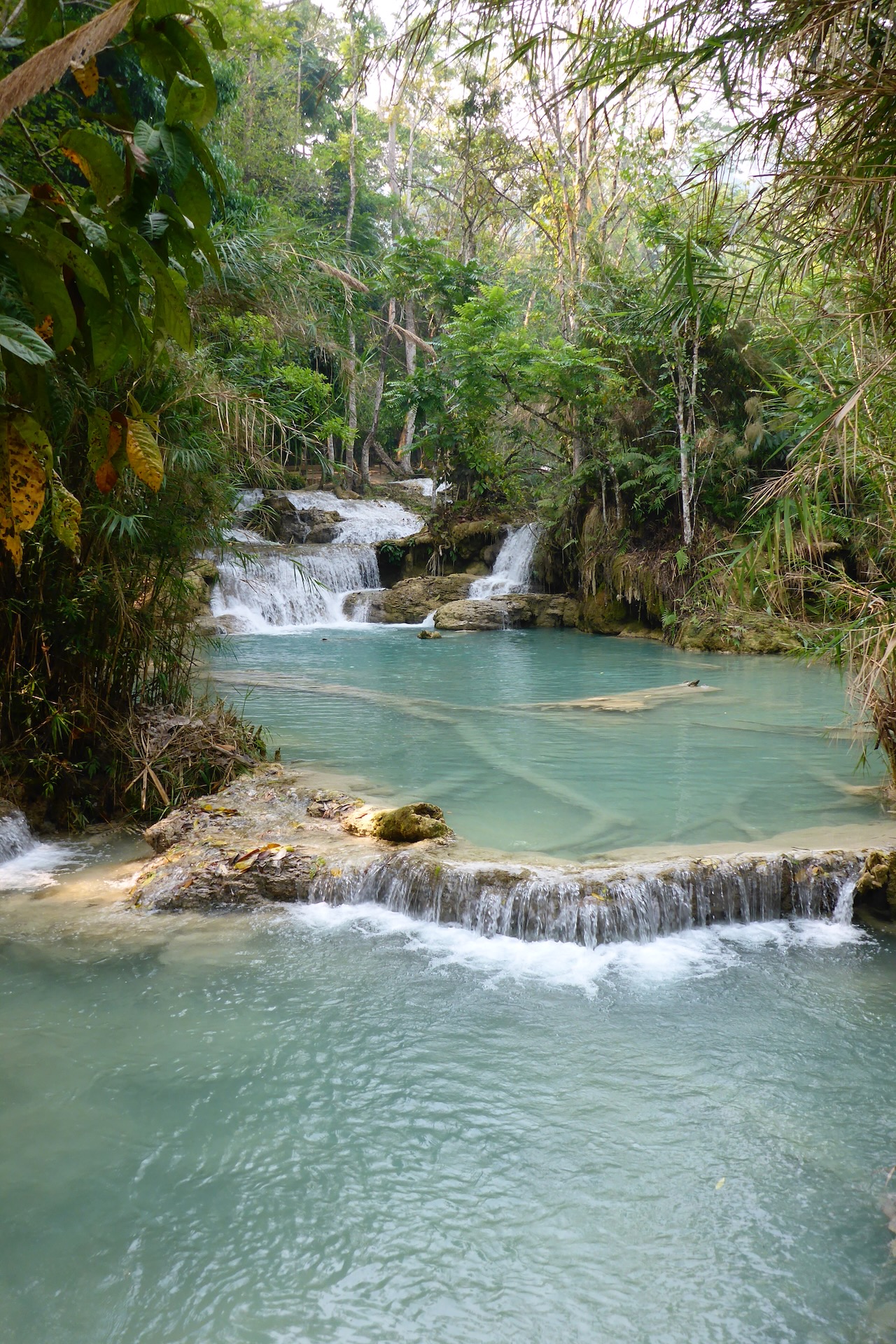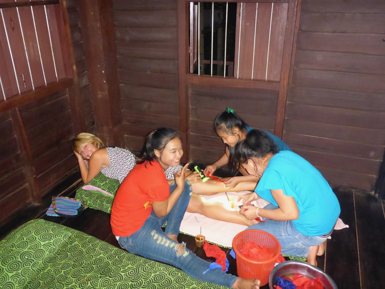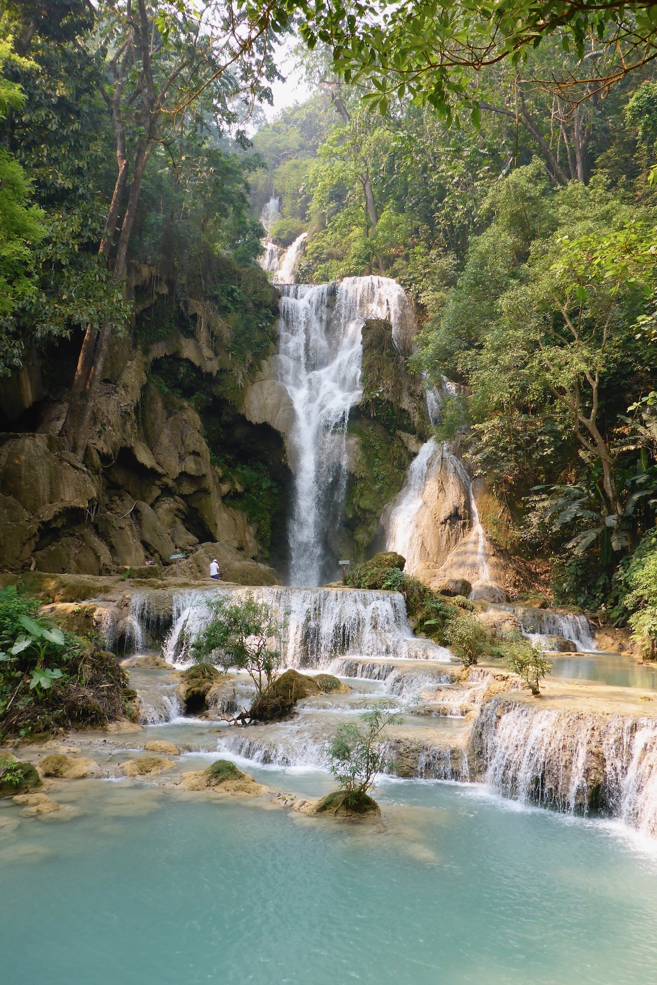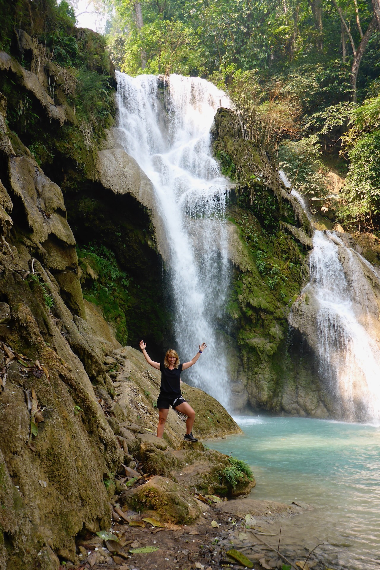 Die Uhr zeigte uns 19:30 Uhr an, als wir den Busbahnhof in Luang Prabang erreichten. Mit dem sorngtaaou (Lieferwagen oder Pick-ups mit Bänken auf beiden Seiten) liessen wir uns in die Stadt fahren, wo wir nach kurzer Zeit das familiengeführte Thephavong Guesthouse als Unterkunft wählten, in der die liebenswerte Vermieterin “das Herzstück” war. Im Anschluss hatten wir die Qual der Wahl zwischen den vielen Baguettes-Ständen, die am Nachtmarkt ansässig waren. Warum gibt es in ganz Laos und insbesondere hier eigentlich so viele Baguettes und Croissants? Laos war von 1893 bis 1953 eine französische Kolonie und das beweisen nicht nur die Gerichte, sondern auch die alten Kolonialvillen, die meisten heutzutage in Boutique-Hotels verwandelt. Luang Prabang besitzt eine besondere Mischung aus altem Charme und buddhistischen Tempeln, hat tolle Cafés und einen entspannten Nachmarkt, was insbesondere an der ruhigen und relaxten Art der Laoten liegt. Die Stadt, die man am besten vom Hügel Pousi überschauen kann, lädt zum faulenzen ein, aber auch die Umgebung hat einiges zu bieten. Der Kuang Si Wasserfall ist hier in aller Munde und so lachten wir 4 uns doch tatsächlich einen netten Tuk-Tuk Fahrer an, damit er uns zu dem 40km entfernten Ort bringt. Um dem Touristentrubel zu entgehen, reisten wir schon um 9 Uhr morgens an und es hatte sich wahrhaftig gelohnt. Die Farben des Wassers sind einfach „wow“. Nachdem wir die ersten Fotos geschossen haben, wollten wir natürlich auch den steil anfallenden Weg zu der oberen Ebene des Wasserfalls wandern. Völlig verschwitzt konnten wir den schönen Blick aus der obersten Etage geniessen und im Anschluss wartete das grüne Wasser auf unsere Überhitzten und etwas muffligen Körper. Während der Rutzel ein Paar “Wasserbomben“ machte, hat sich Frau Rutzel von dem natürlichen „Fisch-Spa“ behandeln lassen- herrlich :-). Es gibt hier auch eine Auffangstation für Malaienbären. Diese wurden aus der Käfighaltung von Privatpersonen gerettet und dürfen nun in einer größeren Anlage zumindest ein etwas besseres Leben führen. Der Rutzel durfte beim betrachten der Tiere den folgenden Satz einer deutschen Touristin belauschen: “Och, die Tiere haben hier so ein schönes Leben…”? Teilen konnte er ihre Meinung nicht, aber wenn man sich unseren Umgang mit der Mutter Natur betrachtet, dann konnte er ihr auch nicht widersprechen.