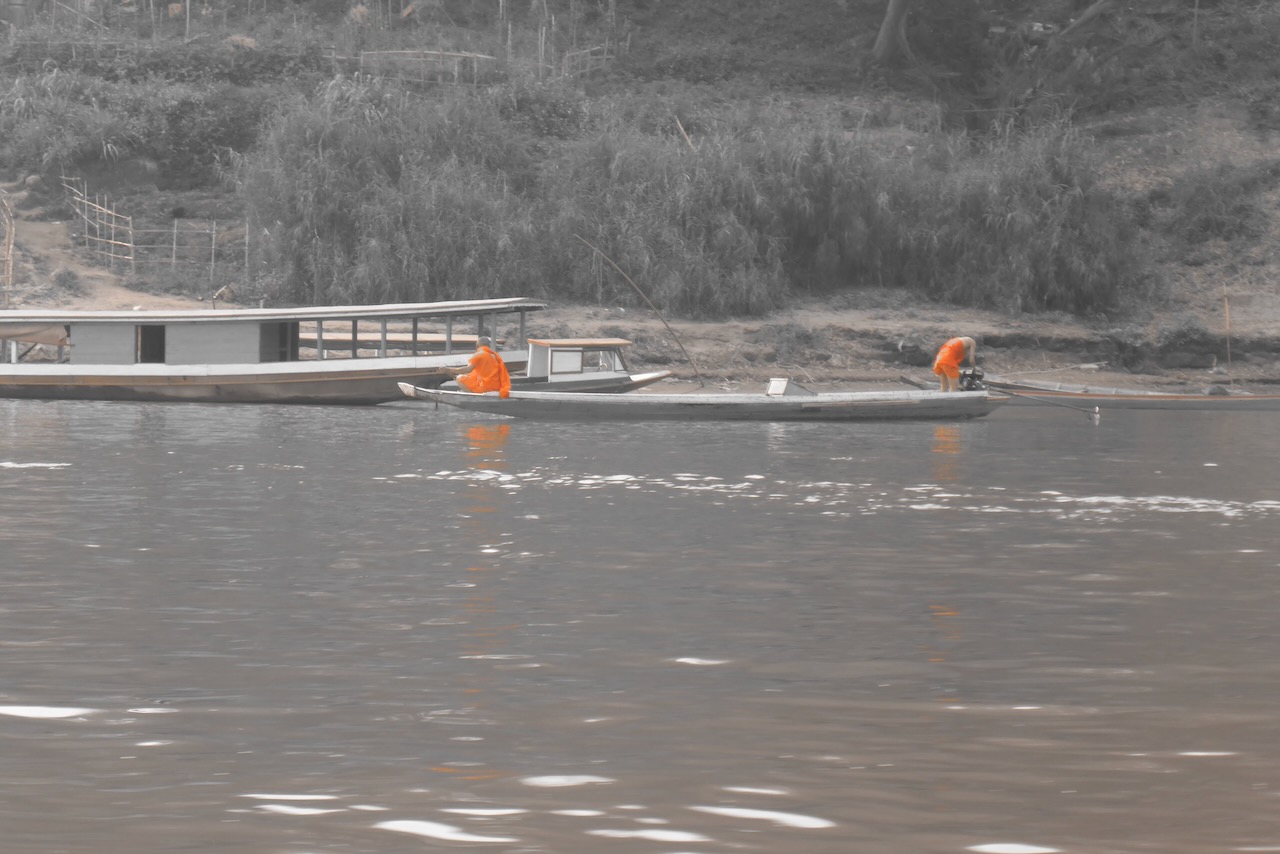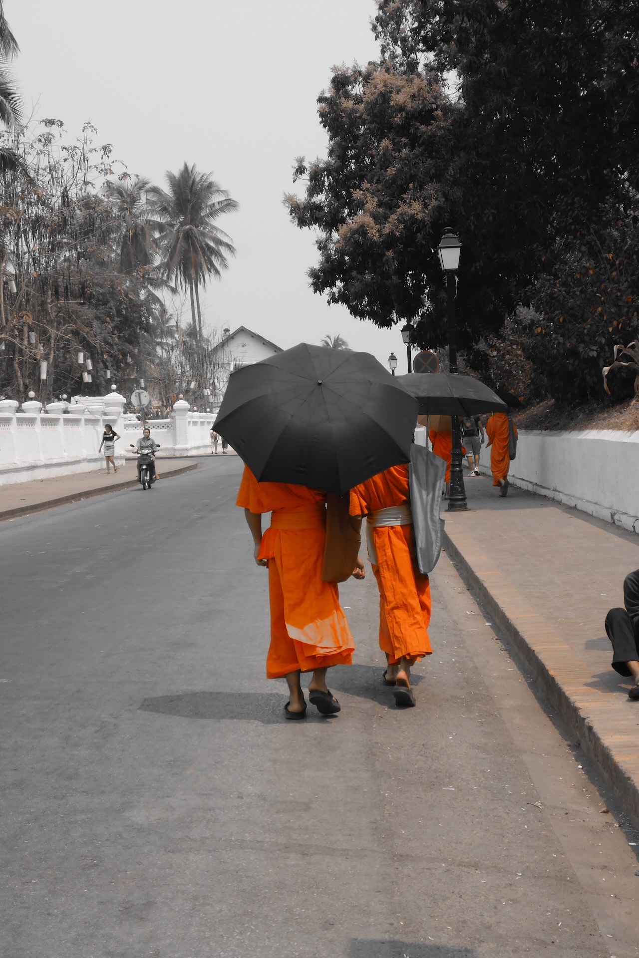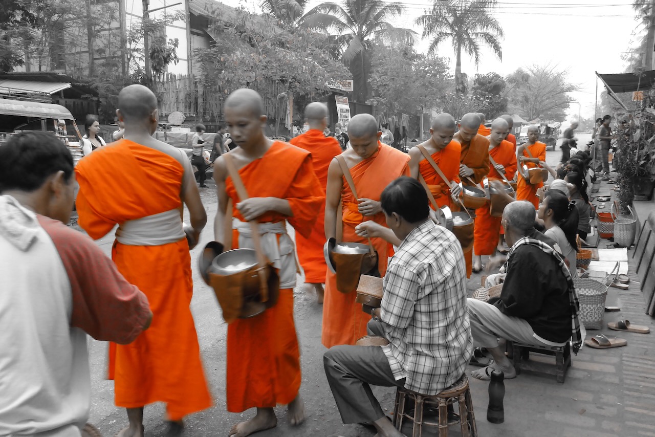 Kulturell kann man in Luang Prabang, abgesehen von den vielen Tempeln, noch einiges mehr erleben, zumindest wenn man sich den Wecker für 5:30 Uhr morgens stellt. Dann kann man die Mönche bei ihrem Gang durch die Gassen beim Einsammeln der Essens-Almosen der Gläubigen im Hintergrund beobachten. Da diese Zeremonie jedoch als touristisches Highlight der Stadt angepriesen wird, ähnelt es teilweise einer Hetzjagd. Schon von weitem sah man ein Blitzlichtgewitter und man kam sich so vor, wie auf dem roten Teppich der Oscar Verleihung. Spätestens in diesem Augenblick wussten wir, dass wir von der Hauptstraße weg müssen um eine Stelle zu wählen, die die Atmosphäre so authentisch wie möglich widerspiegelt. Es gelang uns ganz gut dieses Ritual in Ruhe zu beobachten und das frühe Aufstehen hatte sich für uns auf jeden Fall gelohnt.