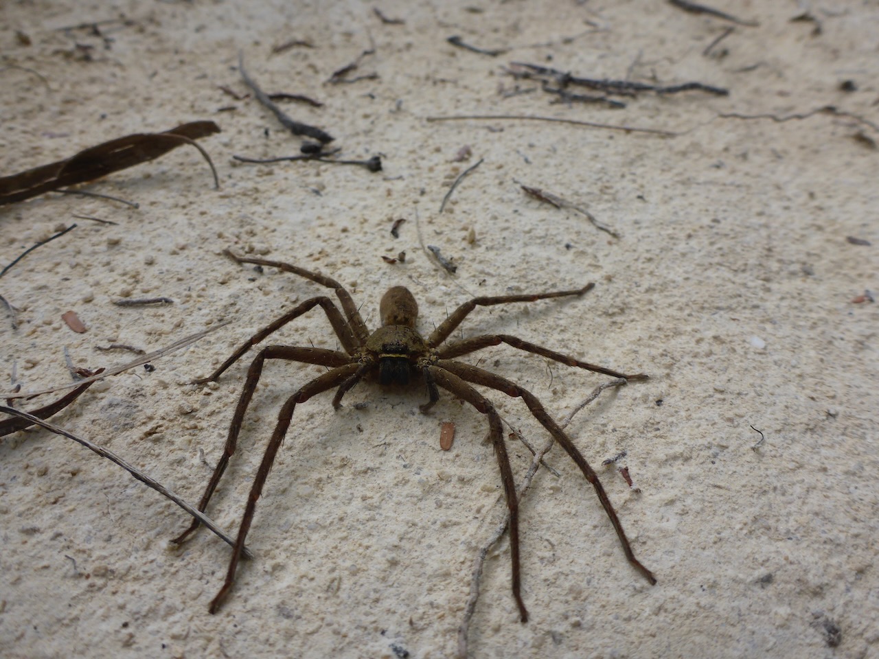 Es gab aber auch Besucher, die sogar den Rutzel kurzzeitig erschreckten. So geschah es auf dem nächsten Spaziergang zur Inselerkundung. Die Tasche war mit den wichtigen Utensilien gepackt und irgendwann auf den Weg bat Frau Rutzel den Rutzel den Regenschirm, der uns regelmäßig als Sonnenschutz dient, aus der Tasche zu holen. Der Rutzel steckte seine rechte Hand rein und suchte ohne hinzuschauen. Er bemerkte ein Gefühl am Finger, als würde er in eine Tannennadel greifen. Er zuckte kurz, suchte weiter und holte kurz darauf den Schirm heraus. Das war aber nicht das einzigste was er aus der Tasche befreite. Über seinen rechten Arm rannte eine Spinne, die in der Größe durchaus bemerkenswert war, und trotz eines zappelnden Rutzels den Weg über seine Brust problemlos schaffte… Frau Rutzel stand auch zappelnd da und mehr als ein uhäää und “oh ist die Ekelhaft” war nicht drin. Irgendwann hatte die Spinne vom Bullenreiten genug und stieg ab. Ehrlich gesagt wissen wir nicht wer von uns drei sich am meisten erschreckte. Die Spinne hatte bestimmt Flipflop-Todesangst. Endlich war die Ruhe bei allen zurück gekehrt und wir konnten das gute Stück, was den Rutzel zum Breakdance brachte, fotografieren.