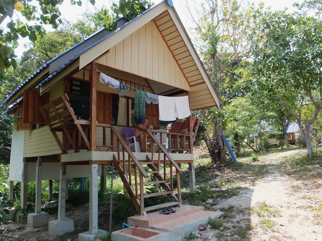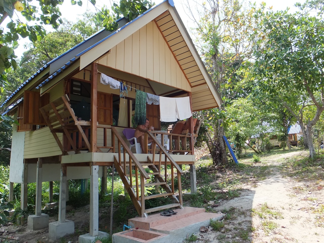 Als erstes schauten wir uns die Bungalows von der Dame aus dem Bus an. Diese waren nicht schlecht aber zu weit vom Strand weg. Danach suchten wir getrennt weiter und jeder von uns fand eine potentielle Bleibe. Einziger Haken daran war, die Unterkunft vom Rutzel gefiel Frau Rutzel nicht und umgekehrt war es das gleiche :-). Also wurde die Suche ausgeweitet und kurze Zeit später zogen wir in eines der 6 Bungalows des Baan Suan Kayoo ein welches von 3 herzlichen Burmesen betreut wurde. Oft und jeden Tag hörten wir die Jüngste lachen, obwohl der Arbeitstag für sie sehr lange war.