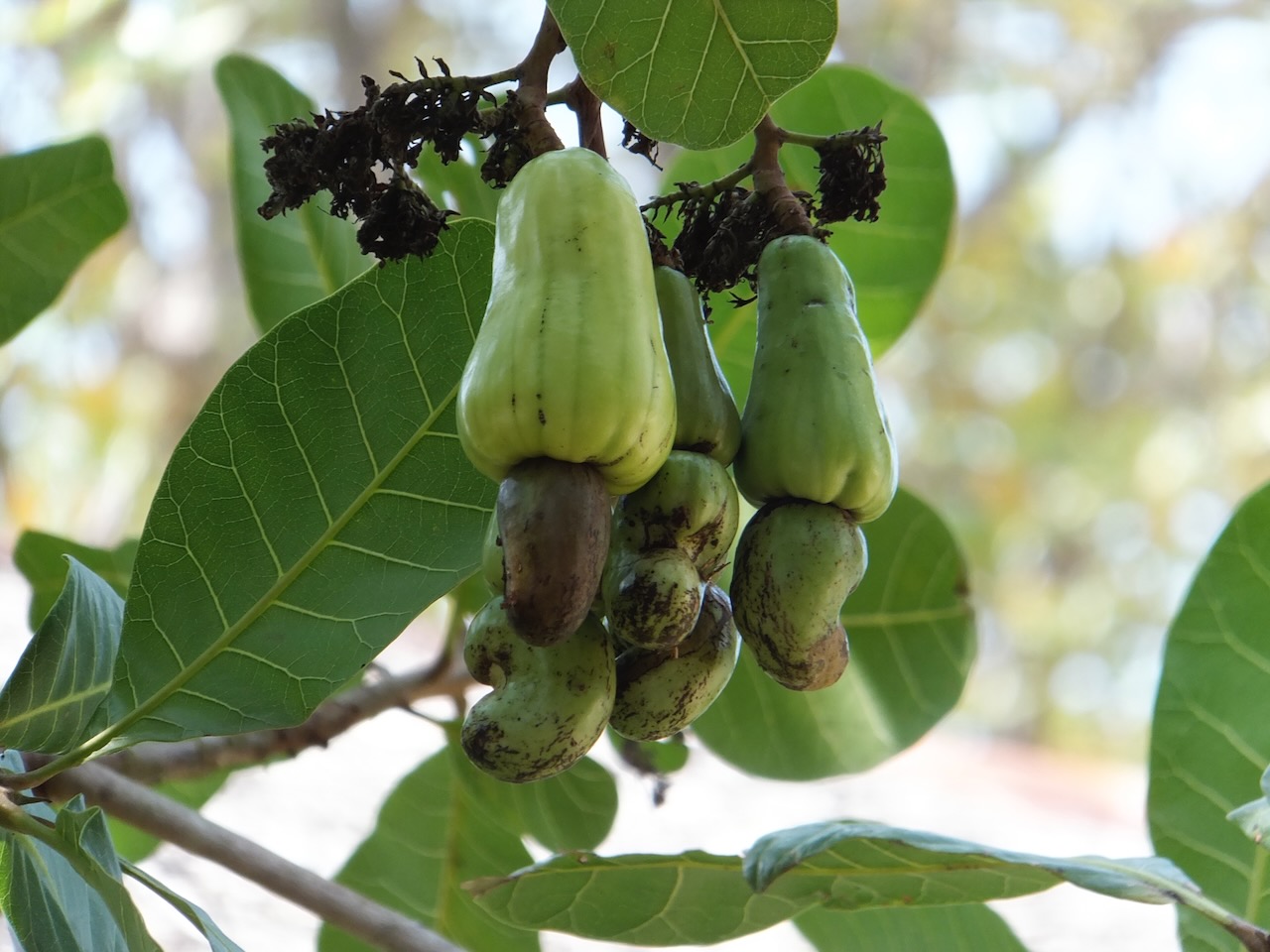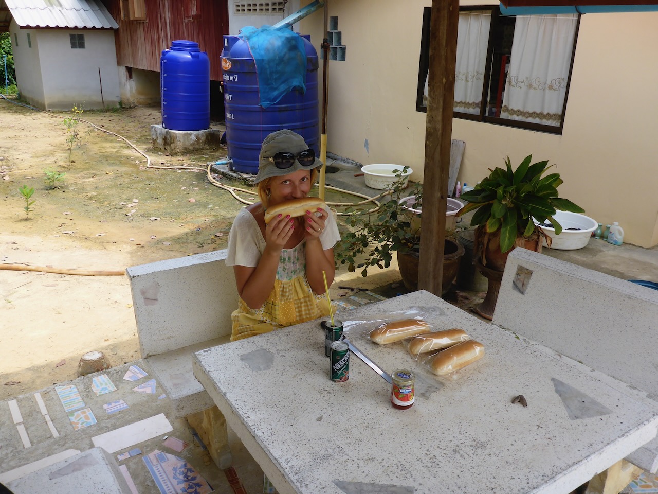 Es gibt auf der Insel insgesamt 3 Strände und wir waren vom größten, dem Ao Yai Beach etwa 7km entfernt. Am dritten Tag war es dann soweit und ein Spaziergang dort hin stand auf dem Programm, um unter anderem auch den Auftrag von unserem lieben Ulf, der im Winter einen Monat auf Koh Phayam eine tolle Zeit erlebte, zu erfüllen. Wir sollten ein paar Freunde von ihm grüßen. Natürlich wurde unser Versprechen eingehalten, auch wenn es uns noch einmal 1km mehr am Strand bis zur Lazy Hut kostete :-). Aber es gibt wirklich schlimmeres. Ja, ehrlich. Ein absolutes Highlight des Tages waren die frisch gebackenen Baguette Brötchen einer Bäckerei auf halbem Weg. Wir gönnten uns gleich 4 Stück mit Marmelade und schaut es Euch auf den Bildern an. Frau Rutzel hat erst ihren Duft genossen und sie danach wort-wörtlich inhaliert. Nach ein paar Stunden chillen in der Lazy Hut, (vielen Dank Ulf!) ging es, natürlich zu Fuß, wieder zurück und immer wieder roch es nach den gärenden Früchten der Kashew Bäume. Die Nuss an der Frucht sieht echt interessant aus und riecht sehr süß und fast hätten wir angefangen Rakia Schnaps aus den Früchten zu machen. Warum? Fast keiner interessierte sich für die Nüsse und die Früchte. Nur einige Einheimische machen sich hier offensichtlich noch die Arbeit diese tolle Leckerei zu verarbeiten. Auf den Rückweg sind uns immer wieder sehr gut gelaunte Thais mit weiß bemalten Gesichtern entgegen gefahren. Es war Songkran- das thailändische Neujahr, bekannt auch als das Wasserfestival. Die Thais bespritzen sich gegenseitig mit Wasser und bemalen sich mit einer uns nicht bekannten Substanz. Übrigens, in Thailand läuft die Zeitrechnung unter Beachtung des buddhistischen Kalenders. Also das Datum auf unseren Tickets ist kein Fehler. In Thailand haben wir das Jahr 2557. Cool, endlich können wir unsere wohlverdiente Rente in Deutschland beantragen. Hört sich doch besser an, als abgemeldeter Arbeitsloser :-). Am Ende des Tages sind wir gute 15km gelaufen. Puh, kann Reisen anstrengend sein.