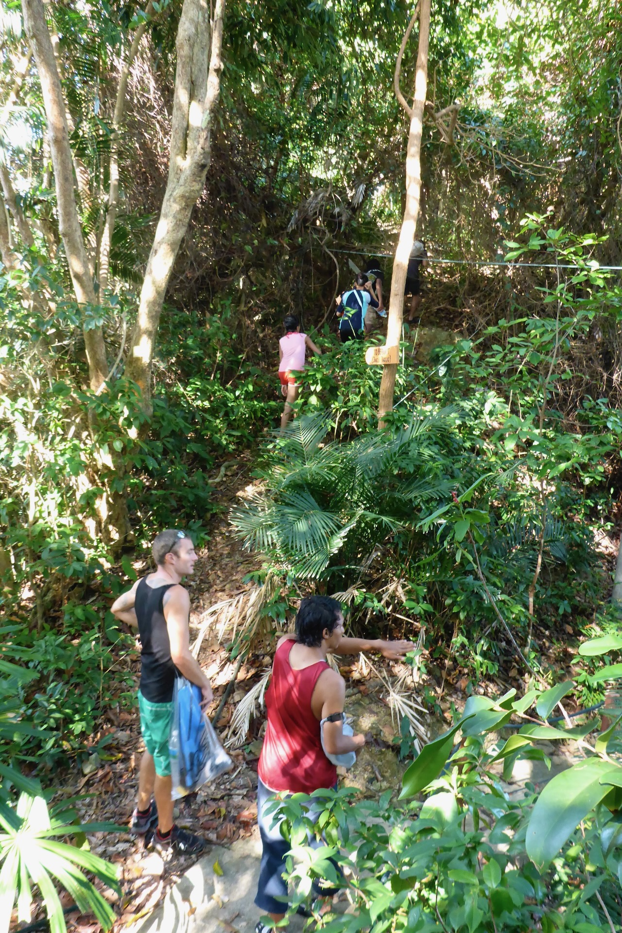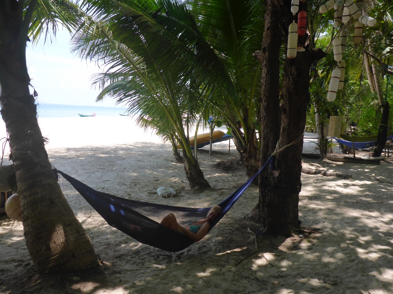 След толкова много екшън човек може да разпусне доволно на един хамак под някоя палма. Иначе няма кой знае какво друго да се прави на Пулау Капас. Тук няма улици, няма превозни средства, няма магазини или супермаркети. Един остров като на Робинзон Крузо. Една единствена пътечка води към другата страна на острова, където има един малък плаж. Ние решихме, че е време за малко повече движение и придружихме малайците, които бяха пристигнали с нас и също бяха отседнали в Capt’s Longhouse и с които междувременно вече се бяхме сприятелили. Походът ни продължи не повече от час, но казвам ви дори в сауната не съм се потила така. Потта просто се лееше от мен като вода, дори по целият ми гръб и раменете…жегата и влажността тук са направо убийствени. Слава Богу най-после стигнахме от другата страна където се насладихме на морският бриз. След едночасова почивка поехме наобратно по друг път, който беше по-къс и не толкова “потен”.