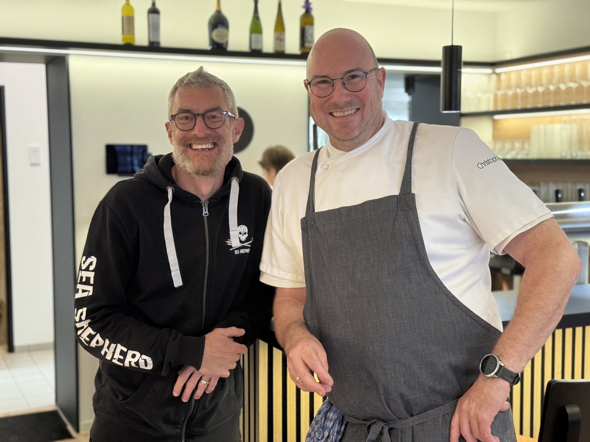 Schnell haben wir im Internet ermittelt wo genau das Restaurant ist und kurz vor der Öffnung standen wir vor der Lieferantentür. Wir saßen bei Regen im Auto, als Christoph in die Lieferanten Tür reingehen wollte. Wir klopften von innen an die Scheibe und er hat überhaupt nicht realisiert, wer der grauhaarige ist, der da herum winkt.