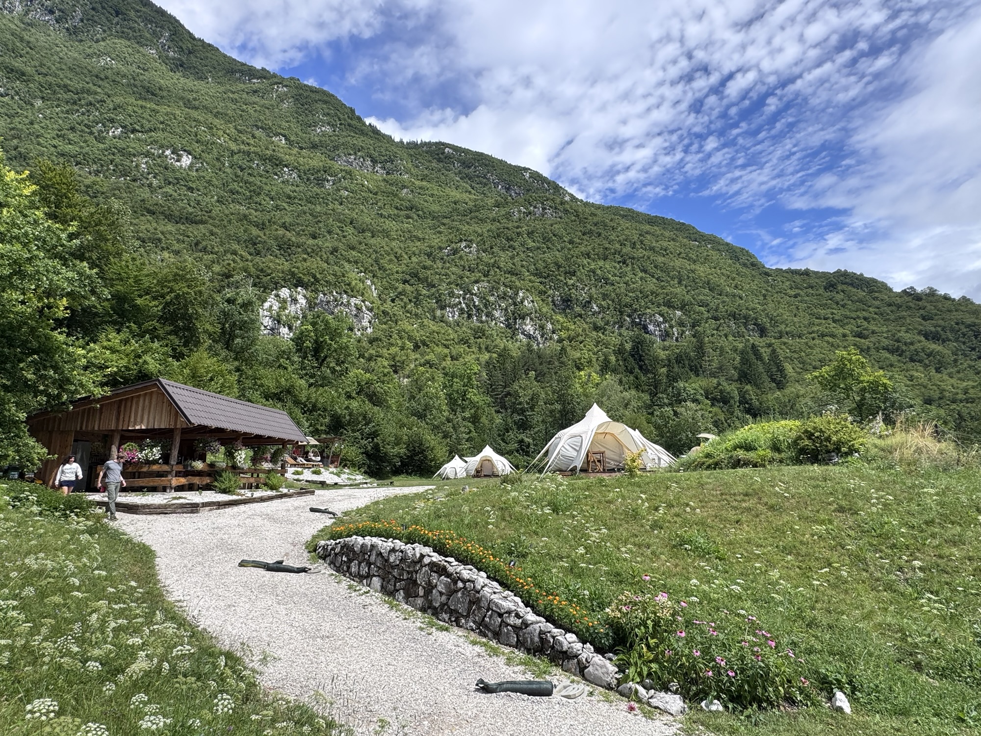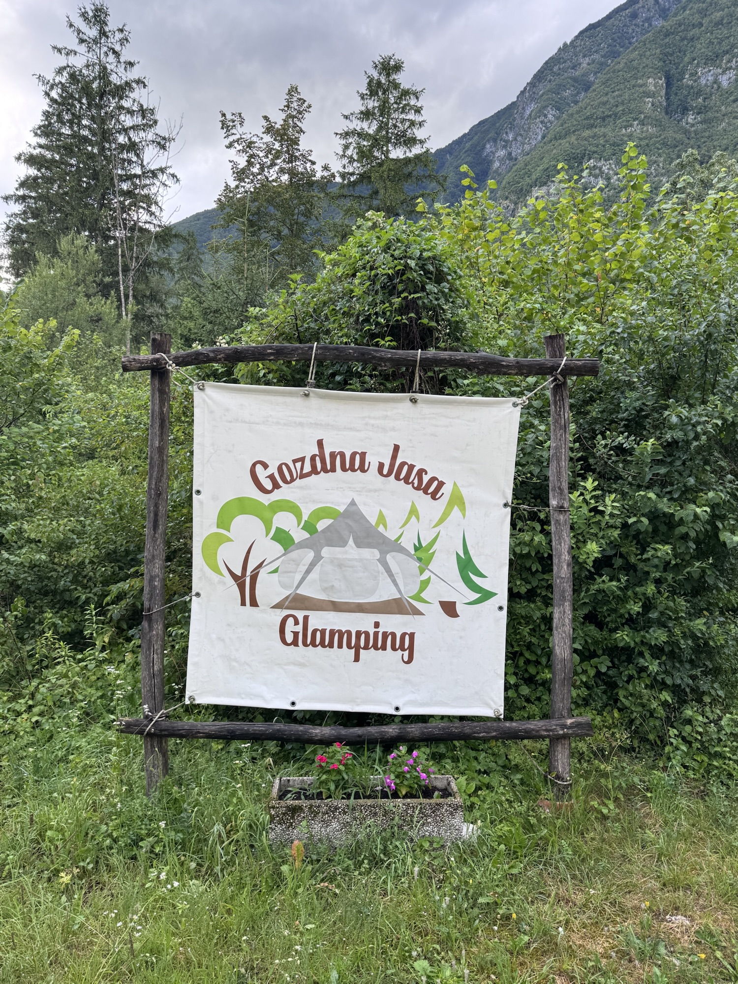 Aber wohin zuerst? Rutzels Like wieder mal ohne Plan 😄. Wir haben uns vorher gar nicht mit diesem Land befasst. Eine Woche vorher hat sich die Matza in zwei Gruppen für Slowenien angemeldet und ein paar Orte aufgeschrieben, die für uns interessant sein könnten. Und erst an der Tankstelle in Udine (also kurz vor der Grenze) hatte der Rutzel geschaut, was am nächsten ist und einen Campingplatz ausgesucht. Und der hat sich als Volltreffer herausgestellt. Der Gozdna Jasa Glamping ist das Herzensprojekt von Monika und David. Die beiden sind super herzlich und haben uns mit wertvollen Tipps für die Gegend versorgt.
