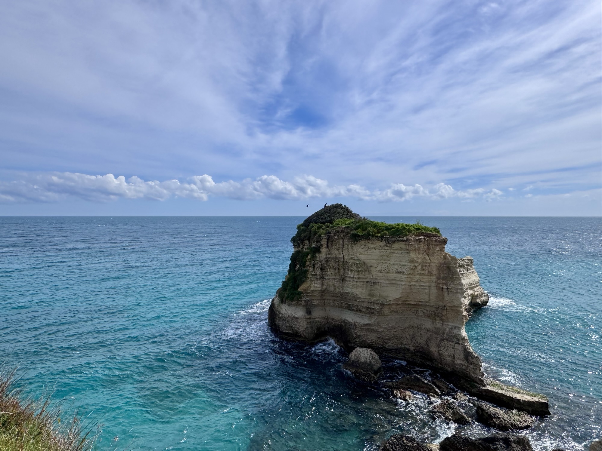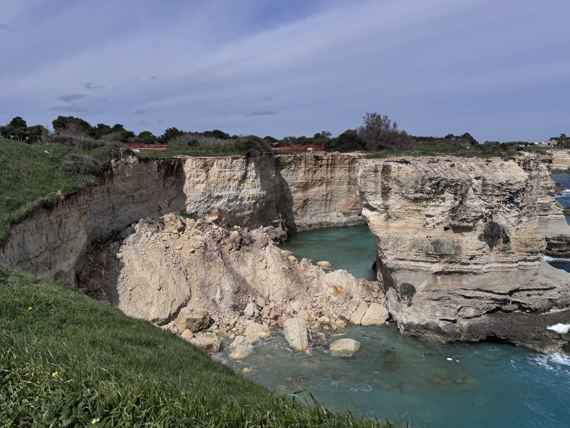 Aus dem Internet: „In der Nacht vom 14. auf den 15. Februar 2026 (am Valentinstag) stürzte nach einer heftigen Unwetterwelle der natürliche Bogen der Faraglioni von Torre Sant’Andrea – lokal als Arco de Lu Pepe und von Besuchern als Arco dell’Amore oder Arco degli Innamorati bekannt – ein. An seiner Stelle bleibt nun ein Haufen von aufscheinenden Felsen.“