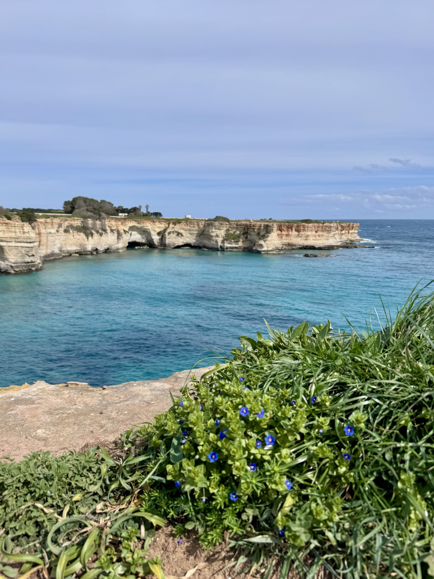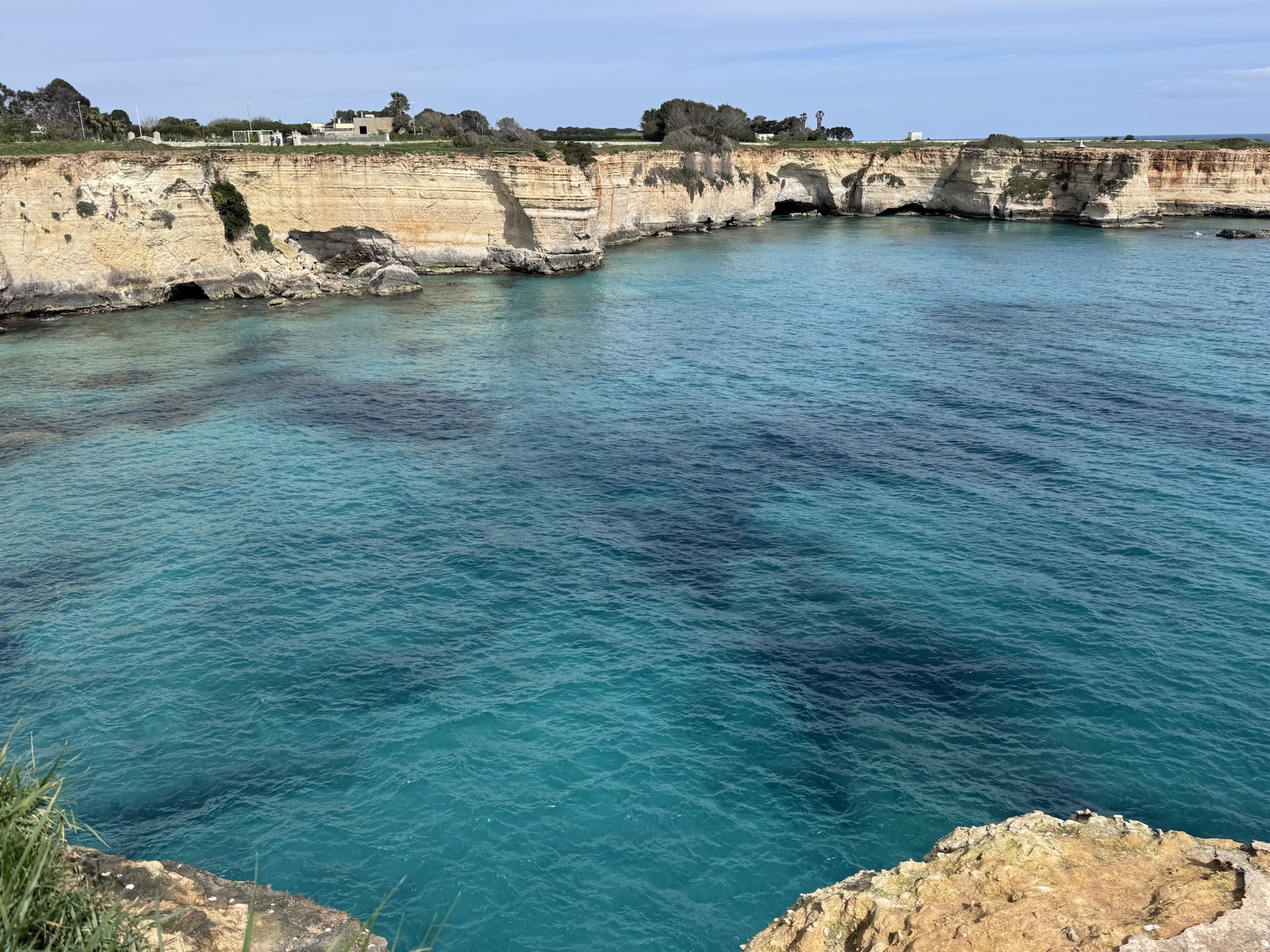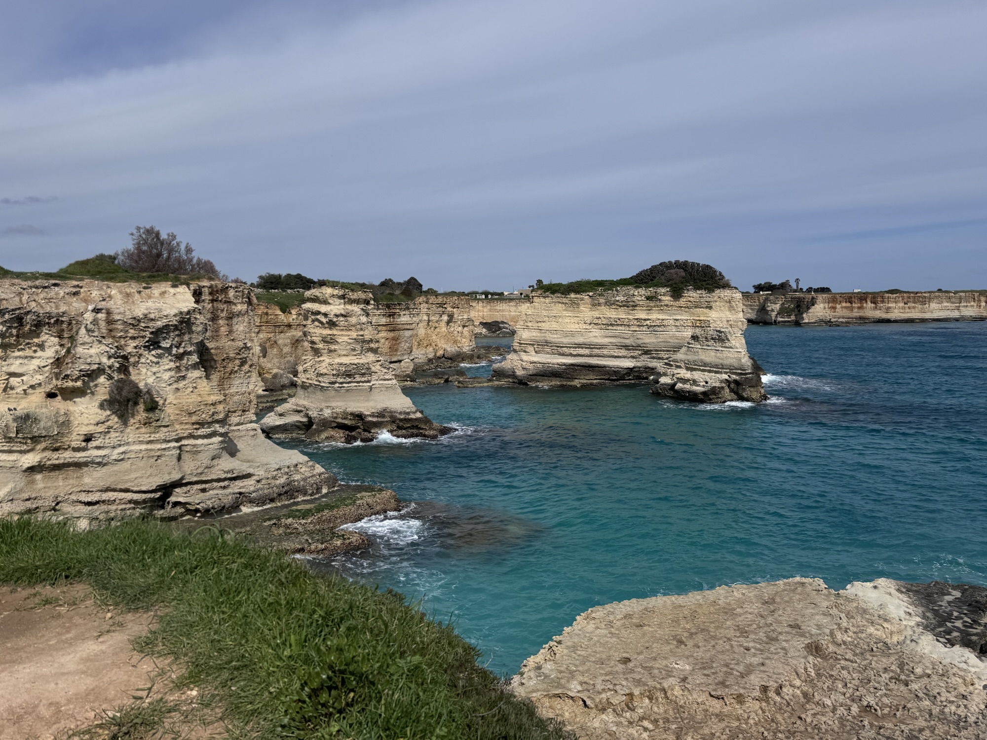 Es ist trotzdem wunderschön hier, das türkise Wasser ist kristallklar und die Felsen erinnern uns wieder an die zwölf Apostel in Australien (genauso wie die Felsformationen in Lagos, Portugal). Wir wandern etwas weiter an der Küste entlang, bis „um die Ecke“, wo man eine schöne Aussicht auf die Bucht von Torre dell‘Orso hat.