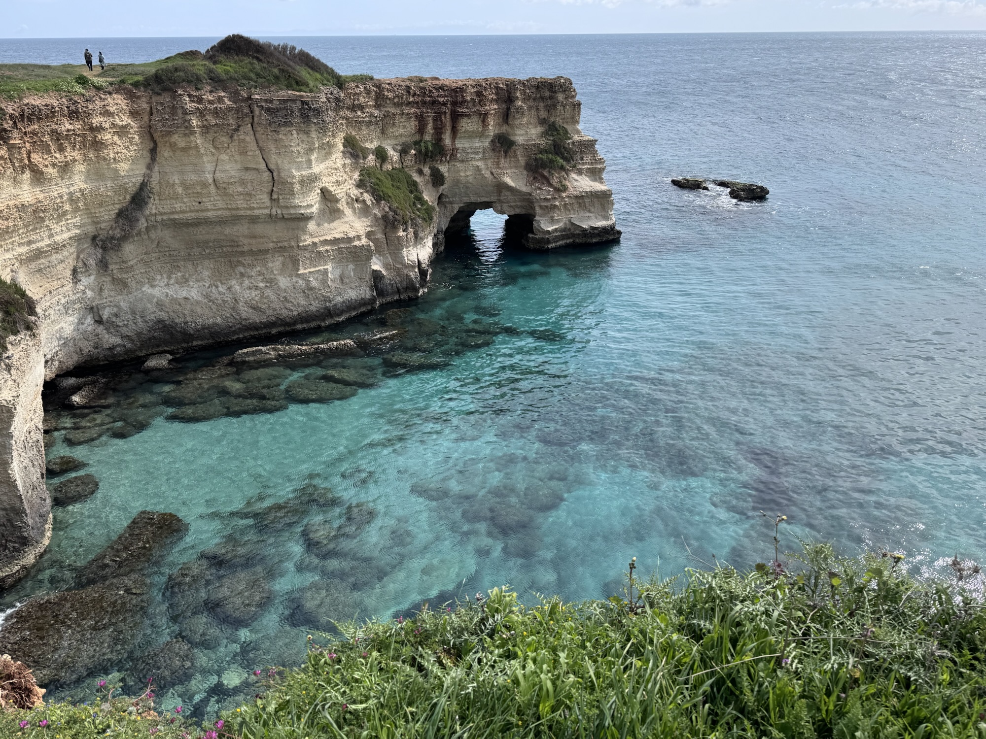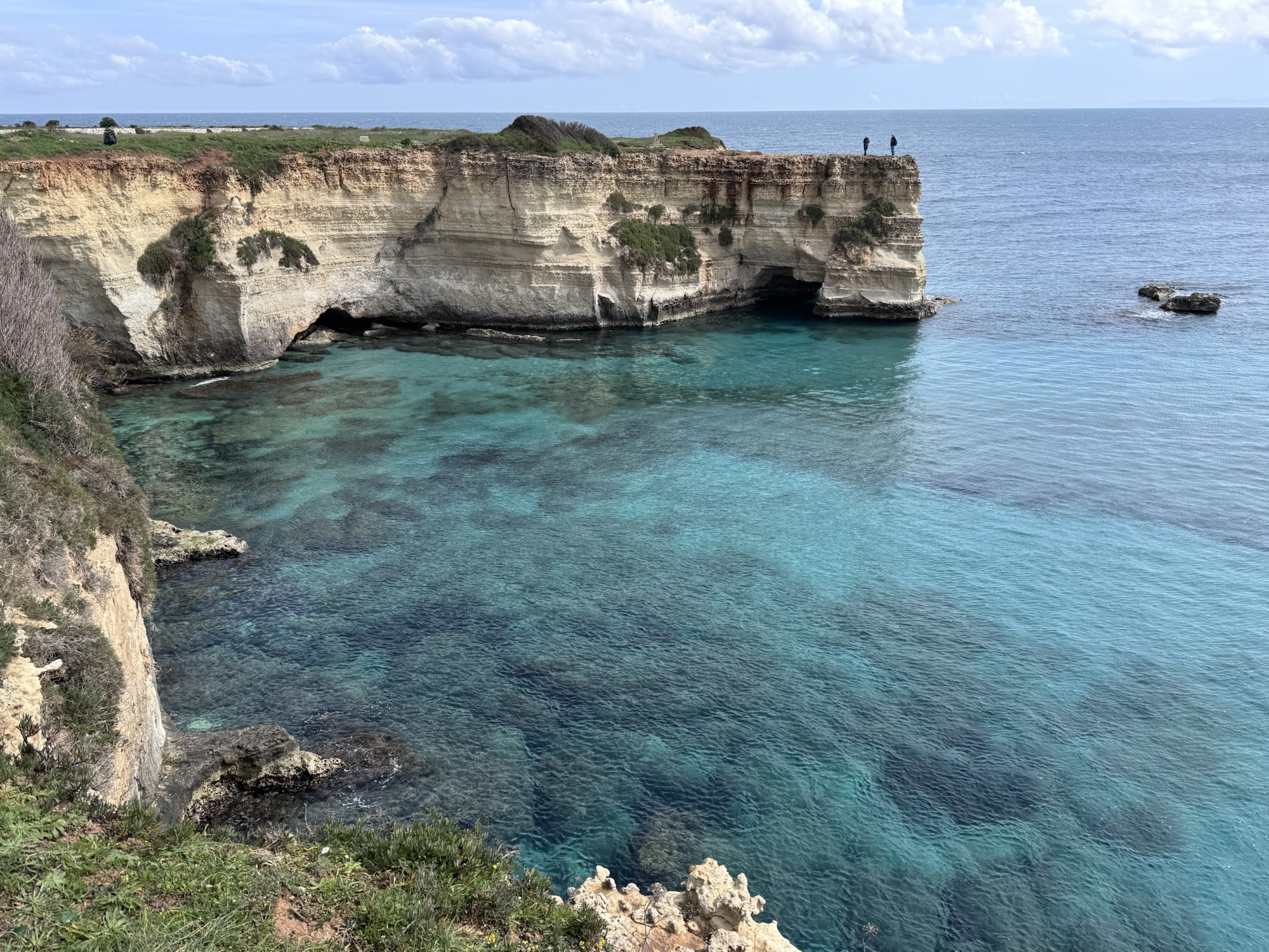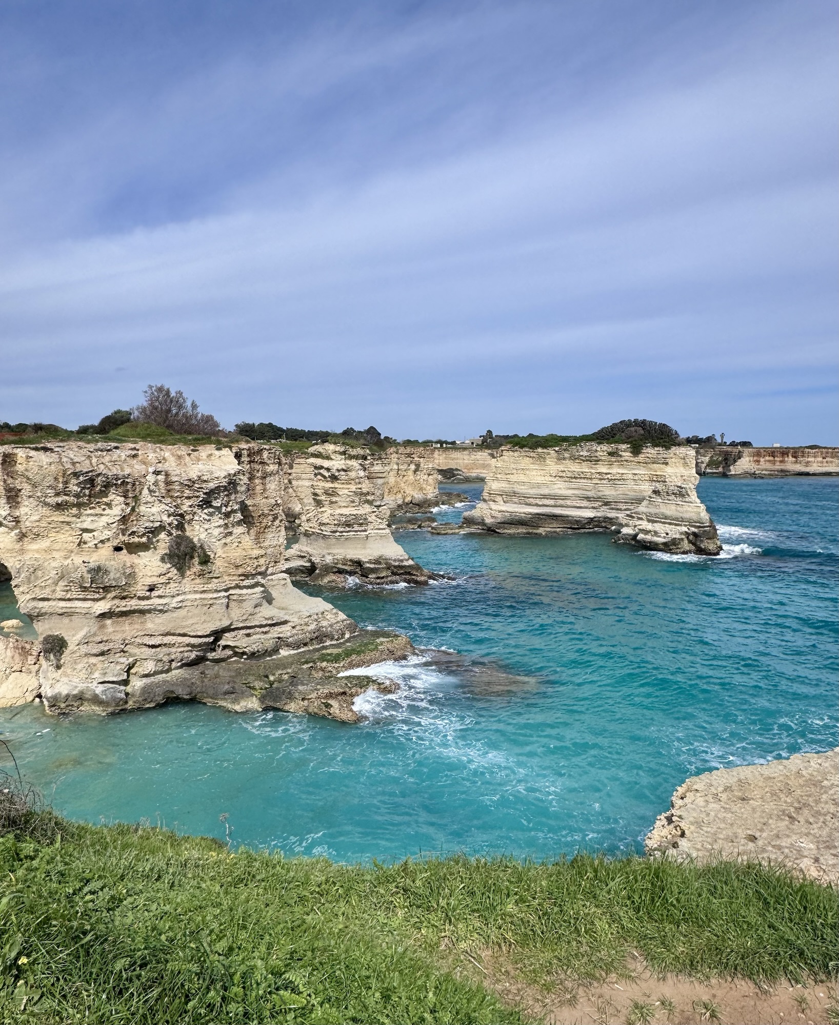 Nach Lecce wollen wir Zeit am Meer verbringen und steuern die Ostküste Apuliens an. Als erstes fahren wir zu der schönen Kalkstein Formation von Sant‘Andrea. Dort angekommen mussten wir feststellen, dass der schöne Felsbogen, den man auf den Fotos im Internet findet, nicht mehr da ist.