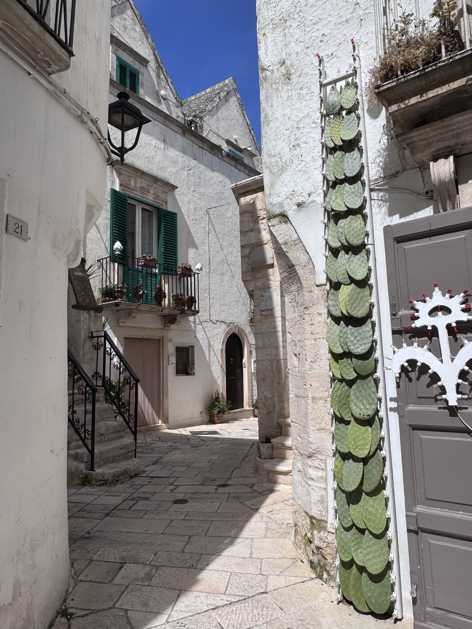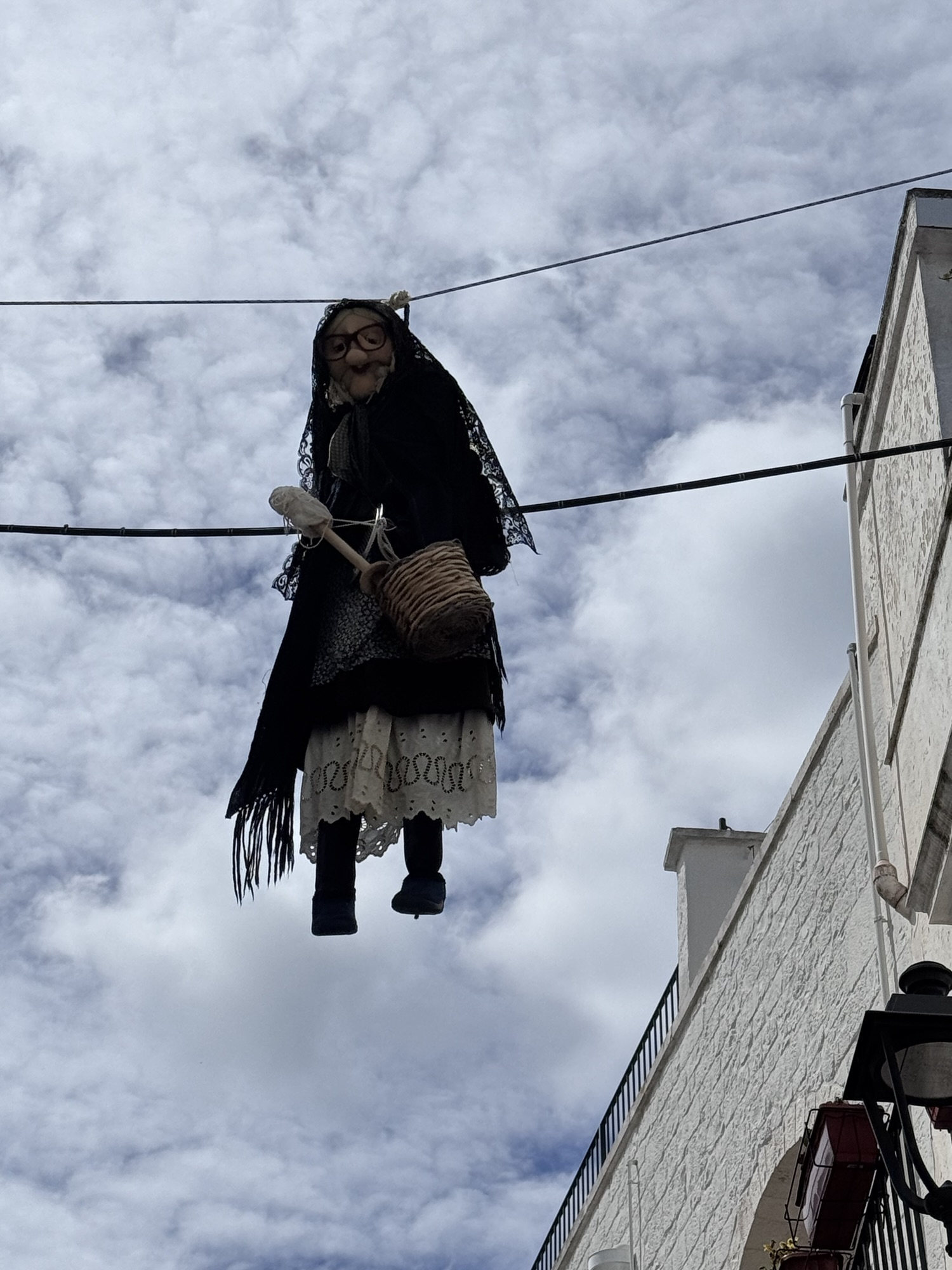 Hier stoßen wir auf eine andere Tradition in Apulien – die hängenden Puppen. Sie sind ein traditioneller Brauch in der Fastenzeit vor Ostern. Die als alte Frauen, mit alten Lumpen gekleideten Puppen sollen das böse austreiben und hängen während der 40-tägigen Fastenzeit bis Ostern und werden am Ende der Zeit verbrannt.