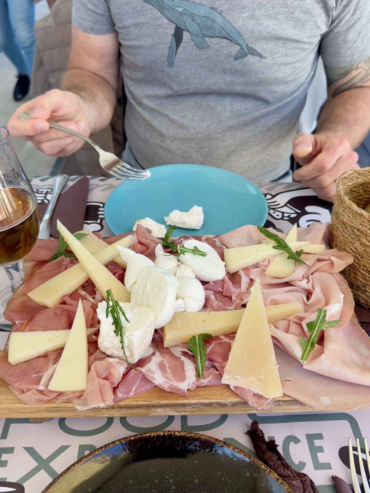 Bevor wir zurück nach Monopili fahren entdecken wir beim herumschlendern noch eine nette Bar abseits des Trubels und entschließen uns endlich eine weitere kulinarische Delikatesse der Region zu probieren, nämlich die Tagliere di salumi e formaggi. Die Platte besteht oft aus regionalen Spezialitäten wie Burrata, Mozzarella, Caciocavallo, Capocollo di Martina Franca (luftgetrockneter Nackenschinken) und Salami. Super lecker, vor allem die im Mund zerfließende Burrata.